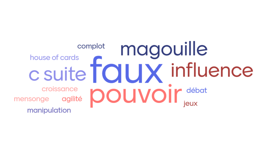 Nuage de mots illustrant les perceptions de la politique organisationnelle : pouvoir, influence, c-suite, faux, magouille, manipulation, jeux, mensonge, etc.
